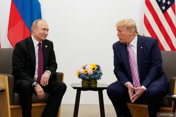 Presiden Rusia Vladimir Putin (kiri) dan Presiden AS Donald Trump saat pertemuan bilateral di KTT para pemimpin G20, di Osaka, Jepang, Jumat (28 /6/2019). ANTARA FOTO/Reuters-Kevin Lamarque/hp.