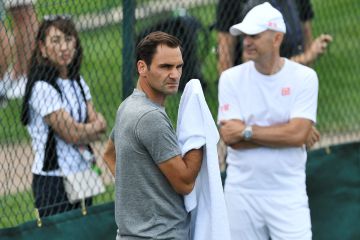 Petenis asal Swiss Roger Federer (tengah) berlatih menjelang digelarnya kejuaraan Tenis Wimbledon di lapangan tenis All England, London, Inggris, Minggu (30/6/2019). Kejuaraan tenis WImbledon akan dimulai Senin (1/7/2019) dan berakhir pada Minggu (14/7/2019). ANTARA FOTO/REUTERS/Tony O'Brien/wsj.