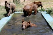 Tiga ekor beruang mandi dan berendam di sebuah kolam untuk mendinginkan suhu tubuhnya di Kebun Binatang Al Zawra, Baghdad, Irak, Sabtu (29/6/2019). ANTARA FOTO/REUTERS/Thaier al-Sudani/wsj.