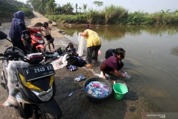 Warga mencuci pakaian di aliran Sungai Cileungsi, Citeureup, Bogor, Jawa Barat, Selasa (2/7/2019). Musim kemarau membuat sebagian warga di kawasan tersebut terpaksa mencuci dan mandi di sungai karena sumur di rumah mereka kering. ANTARA FOTO/Yulius Satria Wijaya/pras.