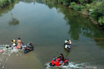 Sejumlah warga mencuci pakaian dan mengambil air di aliran Sungai Cileungsi, Citeureup, Bogor, Jawa Barat, Selasa (2/7/2019). Musim kemarau membuat sebagian warga di kawasan tersebut terpaksa mencuci dan mandi di sungai karena sumur di rumah mereka kering. ANTARA FOTO/Yulius Satria Wijaya/pras.