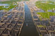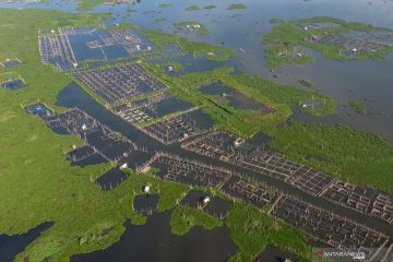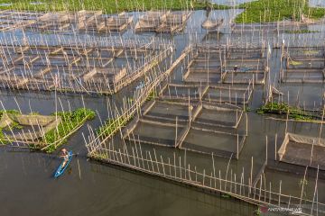 Nelayan beraktivitas di sekitar karamba budidaya ikan air tawar di Danau Rawa Pening, Desa Asinan, Bawen, Kabupaten Semarang, Jawa Tengah, Selasa (2/7/2019). ANTARA FOTO/Aji Styawan/pras.