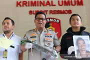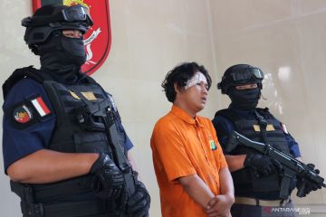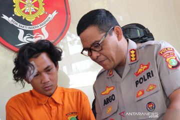 Tersangka kasus perampokan dengan cara pemerasan HP (25) dihadirkan dalam rilis kasus di Mapolda Metro Jaya, Jakarta, Selasa (2/7/2019). Perampokan dengan pemerasan terjadi pada toko pakaian Alva Store di Tangerang (28/6/2019) yang dilakukan oleh tersangka HP (25), D (32) dan tersangka wanita di bawah umur, M (15). ANTARA/Ricky Prayoga/pri