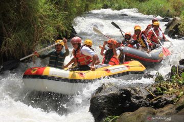 Sejumlah wisatawan bermain arung jeram di alur sungai Pesangan Takengon, Kabupaten Aceh Tengah, Aceh, Selasa (2/7/2019). Wisata petualangan arung jeram merupakan salah satu alternatif tujuan wisata di Kabupaten setempat yang banyak diminati wisatawan terutama kalangan remaja dan pelajar saat mengisi liburan panjang. ANTARA FOTO/Syifa Yulinnas/hp.
