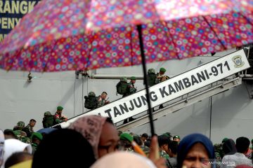 Sejumlah anggota TNI Angkatan Darat naik ke atas kapal KRI Tanjung Kambani-971 saat pemberangkatan Satgas pengamanan perbatasan RI-Papua Nugini di Pelabuhan Sukarno Hatta, Makassar, Sulawesi Selatan, Rabu (3/7/2019). Sebanyak 400 anggota TNI Angkatan Darat kesatuan Batalyon Infanteri 721/Makkasau diberangkatkan untuk bertugas mengamankan wilayah perbatasan RI-Papua Nugini selama sembilan bulan. ANTARA FOTO/Abriawan Abhe/hp.