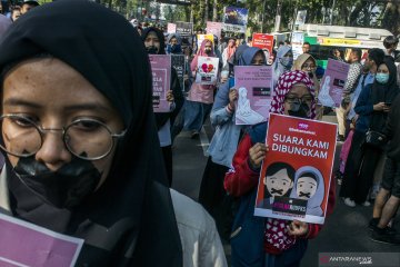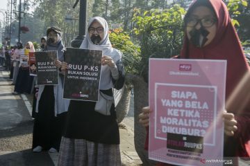 Aktivis dari Aliansi Gerakan Peduli Perempuan melakukan aksi bungkam tolak Rancangan Undang-Undang Penghapusan Kekerasan Seksual (RUU PKS) di kawasan Hari Bebas Kendaraan, Dago, Bandung, Jawa Barat, Minggu (7/7/2019). Aksi tersebut dilakuan sebagai bentuk ketidaksetujuan atas rencana pengesahan RUU PKS yang dianggap masih bermakna rancu terkait budaya, agama, dan norma sosial di masyarakat. ANTARA FOTO/Novrian Arbi/hp.