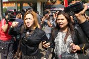 Artis Barbie Kumalasari (kiri), istri Galih Ginanjar, selepas keluar ruang penyidik Ditreskrimsus Polda Metro Jaya, Jakarta, Kamis (11/7/2019) untuk penjengukan. Pada Hari Kamis, Polda Metro Jaya menetapkan tiga tersangka dalam kasus pencemaran nama baik dengan kata-kata "ikan asin" yang dilaporkan oleh Fairuz A Rafiq tersebut, yakni pasangan YouTuber Pablo Benua dan Rey Utami serta sang nara sumber Galih Ginanjar. ANTARA/Ricky Prayoga/pri