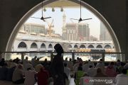 Seorang jamaah melintas diantara jendela saat memasuki waktu shalat Jumat di Masjidil Haram, Makkah, Arab Saudi, Jumat (12/7/2019). Mereka memilih tempat yang lebih teduh karena suhu di luar ruangan mencapai lebih dari 40 derajat celcius. ANTARA/Hanni Sofia/aa