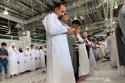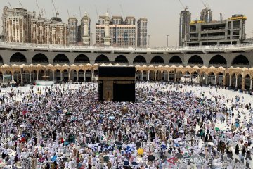 Sejumlah jamaah melakukan shalat Jumat di Masjidil Haram di bawah suhu lebih dari 40 derajat celcius, Makkah, Arab Saudi, Jumat (12/7/2019). Mereka berdatangan dari berbagai negara untuk melaksakan ibadah Haji 1440 Hijriah. ANTARA/Hanni Sofia/aa