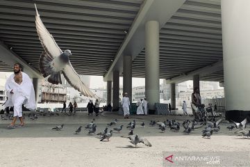 Merpati menjadi salah satu daya tarik yang ada di sekitar Terminal Gaza salah satu pintu masuk menuju Masjidil Haram (12/7/2019). Merpati-merpati ini dibiarkan liar bahkan dilarang oleh Pemerintah Arab Saudi untuk ditangkap karena dipercaya sebagai keturunan merpati yang menyelamatkan Nabi Muhammad dalam perjalanan hijrah dari Mekkah ke Madinah. ANTARA/Hanni Sofia/am.