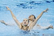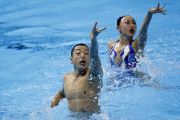 Pasangan perenang indah Jepang Yumi Adachi dan Atsushi Abe beraksi dalam babak penyisihan nomor Duet Teknik Campuran Kejuaraan Renang Dunia FINA ke-18 di Gimnasium Yeomju, Korea Selatan, Sabtu (13/7/2019). ANTARA FOTO/REUTERS/Stefan Wermuth/wsj.