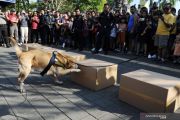 Seekor anjing pelacak (K9) narkotika memeriksa barang kargo saat simulasi dalam kegiatan "Bea Cukai on The Street" di kawasan Renon, Denpasar, Bali, Minggu (14/7/2019). Kegiatan yang diselenggarakan Kanwil Direktorat Jenderal Bea dan Cukai Bali Nusra, Kantor Pengawasan dan Pelayanan Bea Cukai Ngurah Rai dan Denpasar tersebut untuk memberikan edukasi dan mensosialisasikan upaya pemberantasan barang terlarang serta tugas-tugas Bea Cukai kepada masyarakat. ANTARA FOTO/Fikri Yusuf/pras.
