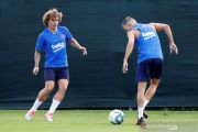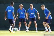 Tiga pemain baru Barcelona Frenkie de Jong (kiri), Neto (kedua kiri) dan Antoine Griezmann berlatih bersama rekan timnya di tempat latihan FC Barcelona, Ciutat Esportiva Joan Gamper, Barcelona, Senin (15/7/2019). ANTARA FOTO/REUTERS/Albert Gea/pras.