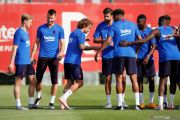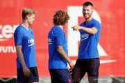 Pemain baru Barcelona Antoine Griezmann berlatih bersama rekan timnya di tempat latihan FC Barcelona, Ciutat Esportiva Joan Gamper, Barcelona, Senin (15/7/2019). ANTARA FOTO/REUTERS/Albert Gea/pras.