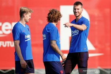 Tiga pemain baru Barcelona Frenkie de Jong (kiri), Neto dan Antoine Griezmann berlatih bersama rekan timnya di tempat latihan FC Barcelona, Ciutat Esportiva Joan Gamper, Barcelona, Senin (15/7/2019). ANTARA FOTO/REUTERS/Albert Gea/pras.