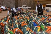 Dua orang petugas PPIH menyusuh koper milik jemaah calon haji (JCH) dari kloter pertama Surabaya saat tiba di hotel Al Okhs, Mahbas Jin, Mekkah, Minggu malam (14/7/2019). Kloter ini adalah rombangan jamaah pertama Indonesia yang tiba di Mekkah setelah menempuh perjalanan darat selama 4 jam dari Madinah. ANTARA/Hanni Sofia/aa