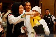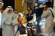 Sejumlah petugas PPIH memberi minum kepada jamah calon haji (JCH) lanjut usia dari kloter pertama Surabaya saat tiba di hotel Al Okhs, Mahbas Jin, Mekkah, Minggu malam (14/7/2019). Kloter ini adalah rombangan jamaah pertama Indonesia yang tiba di Mekkah setelah menempuh perjalanan darat selama 4 jam dari Madinah. ANTARA/Hanni Sofia/aa