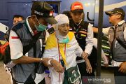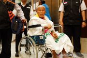 Seorang amah calon haji (JCH) lanjut usia dari kloter pertama Surabaya menggunakan kursi roda saat tiba di hotel Al Okhs, Mahbas Jin, Mekkah, Minggu malam (14/7/2019). Kloter ini adalah rombangan jamaah pertama Indonesia yang tiba di Mekkah setelah menempuh perjalanan darat selama 4 jam dari Madinah. ANTARA/Hanni Sofia/aa