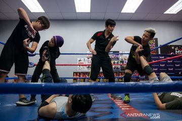 Atlet gulat asal Malaysia Nor "Phoenix" Diana (kanan) latihan bersama pegulat pria lainnya di sebuat pusat latihan gutat di di Kuala Lumpur, Malaysia (6/7/2019). Mengikuti turnamen lokal Malaysia Pro Wrestling (MyPW), yang memiliki kesamaan dengan World Wrestling Entertainment yang sangat populer di Amerika Serikat. ANTARA/AFP/Mohd RASFAN/aa
