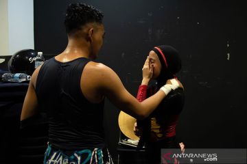 Atlet gulat asal Malaysia Nor "Phoenix" Diana bersolek di belakang ring usai mengikuti pertandingan yang diselenggarakan oleh Malaysia Pro Wrestling di Kuala Lumpur, Malaysia (6/7/2019). Biasa tampil beda dan selalu menarik perhatian di atas ring saat atlet tersebut bertanding di cabang olahraga yang didominasi kaum pria. ANTARA/AFP/Mohd RASFAN/aa