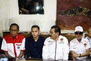 Anak dari pelawak Nunung Srimulat, Bagus Permadi (tengah) didampingi Ketua Gerakan Peduli Anti Narkoba (GPAN), Brigjen Pol Siswandi (kanan) dan pelawak Tarzan (kiri) memberikan keterangan pers terkait kasus narkoba pelawak Nunung di Jakarta, Sabtu (20/7/2019). Pelawak Nunung Srimulat ditangkap tim dari Subdit 1 Ditresnarkoba Polda Metro Jaya pada Jumat (19/7) karena kasus narkoba. ANTARA FOTO/Rivan Awal Lingga/hp.