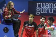 Wasit asal Australia Kelly Hoare (kiri) mengenakan kemeja batik saat memimpin pertandingan babak semifinal Blibli Indonesia Open 2019 di Istora Senayan, Jakarta, Sabtu (20/7/2019). Pada babak semifinal Blibli Indonesia Open 2019 ofisial pertandingan seperti wasit, service judge dan hakim garis mengenakan pakaian tradisional Indonesia sesuai konsep "Sport-Artainment" dari ajang kejuaraan dunia bulu tangkis tersebut serta untuk memperkenalkan kebudayaan Indonesia. ANTARA FOTO/Hafidz Mubarak A/wsj/pri