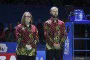 Wasit asal Australia Kelly Hoare (kiri) dan "Service Judge" asal Kanada Remi Beaulieu mengenakan kemeja batik saat memimpin pertandingan babak semifinal Blibli Indonesia Open 2019 di Istora Senayan, Jakarta, Sabtu (20/7/2019). Pada babak semifinal Blibli Indonesia Open 2019 ofisial pertandingan seperti wasit, service judge dan hakim garis mengenakan pakaian tradisional Indonesia sesuai konsep "Sport-Artainment" dari ajang kejuaraan dunia bulu tangkis tersebut serta untuk memperkenalkan kebudayaan Indonesia. ANTARA FOTO/Hafidz Mubarak A/wsj.
