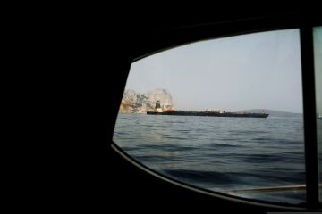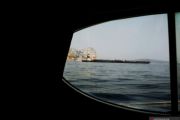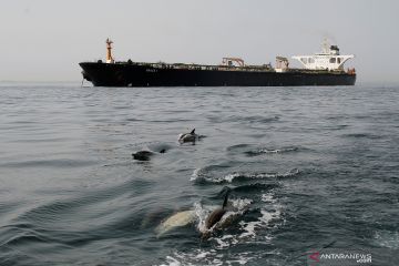 Sejumlah lumba-lumba berenang di dekat kapal tanker minyak Iran Grace 1 yang ditangkap awal bulan ini oleh Marinir Kerajaan Inggris di lepas pantai wilayah Mediterania Inggris, di Selat Gibraltar, Spanyol Selatan, Spanyol, Sabtu (20/7/2019). Angkatan Laut Kerajaan Inggris menahan kapal tanker atas dugaan pelanggaran sanksi terhadap Suriah. ANTARA FOTO/REUTERS/Jon Nazca/wsj.