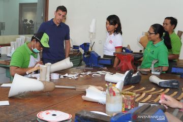 Mantan pesepak bola Manchester United Gary Neville (kedua kiri) mengamati aktivitas pembuatan kaki palsu oleh penyandang disabilitas saat mengunjungi Annika Linden Centre di Denpasar, Bali, Senin (22/7/2019). Dalam kunjungannya, Gary Neville memberikan coaching clinic dan motivasi kepada para penyandang disabilitas sekaligus mengamati aktivitas di sejumlah yayasan yang ada di pusat kegiatan sosial Annika Linden Centre tersebut. ANTARA FOTO/Fikri Yusuf/pras.