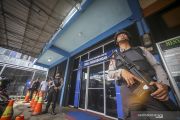 Anggota Polisi Polres Tanjungpinang berjaga di depan kantor Dinas Perhubungan Provinsi Kepulauan Riau saat dilakukannya penggeledahan oleh petugas KPK di Tanjungpinang, Kepulauan Riau, Selasa (23/7/2019). Dalam pemeriksaan yang belum diketahui terkait kasus apa tersebut penyidik KPK menyita sejumlah dokumen yang dibawa menggunakan tiga koper besar. ANTARA FOTO/Andri Mediansyah/Mnk/hp.