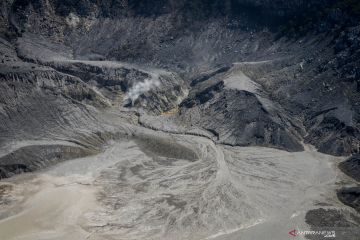 Kepulan asap keluar dari Kawah Ratu Gunung Tangkuban Parahu di Kabupaten Bandung Barat, Jawa Barat, Selasa (23/7/2019). Berdasarkan hasil rekaman seismograf pos pengamatan PVMBG Tangkuban Parahu mencatat, pada 21 Juli 2019 terpantau terjadi 425 kali gempa hembusan Gunung Tangkuban Parahu serta kegempaan tremor harmonik berjumlah dua kali dengan amplitudo 1.5-2 mm serta durasi 44-45 detik. ANTARA FOTO/Raisan Al Farisi/hp.