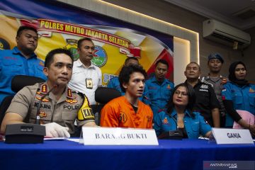 Kapolres Metro Jakarta Selatan Kombes Pol Indra Jafar (kiri) didampingi Kasat Narkoba Kompol Vivick Tjangkung (kanan) menghadirkan aktor Jefri Nichol (tengah) yang terjerat kasus narkoba saat rilis di Polres Metro Jakarta Selatan, Jakarta, Rabu (24/7/2019). Aktor Jefri Nichol ditangkap atas dugaan kepemilikan narkotika dengan barang bukti ganja seberat 6,01 gram. ANTARA FOTO/Dhemas Reviyanto/ama.