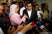 Menteri Hukum dan Hak Asasi Manusia (HAM) Yasonna H. Laoly (ketiga kanan) berjabat tangan dengan terpidana kasus pelanggaran Undang-Undang Transaksi dan Informasi Elektronik (UU ITE) Baiq Nuril Maknun (ketiga kiri) usai rapat kerja bersama Komisi III DPR di Kompleks Parlemen, Senayan, Jakarta, Rabu (24/7/2019). DPR menyetujui surat pertimbangan Presiden Joko Widodo tentang pemberian amnesti untuk Baiq Nuril. ANTARA FOTO/Rivan Awal Lingga/ama.