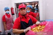 Seorang pekerja menunjukkan menu ayam rica-rica yang dimasak khusus untuk jamaah Indonesia di Dapur Cordoba, Mekkah, Arab Saudi, Kamis (25/7/2019). Perusahaan itu merupakan salah satu katering yang bertugas menyiapkan lebih dari 2.700 porsi makanan untuk jamaah asal Indonesia setiap hari selama musim haji. ANTARA/Hanni Sofia/aa