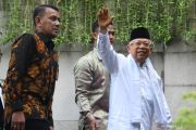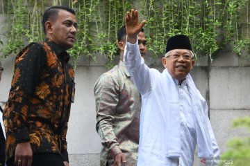 Wakil Presiden terpilih periode 2019-2024 KH Ma'ruf Amin (kanan) berjalan memasuki lokasi pertemuan dengan Tim Kampanye Nasional (TKN) Joko Widodo - KH Ma'ruf Amin di Jakarta, Jumat (26/7/2019). Parpol koalisi pengusung pasangan Jokowi-Amin sepakat untuk membubarkan TKN. ANTARA FOTO/Akbar Nugroho Gumay/wsj.