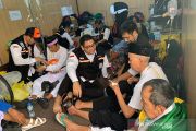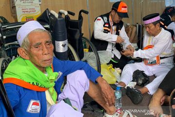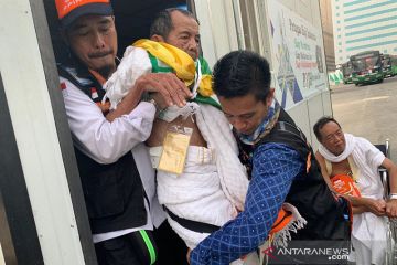 Tim Gerak Cepat (TGC) membantu seorang anggota jamaah lansia yang mengalami gangguan kesehatan saat selesai melakukan umrah wajib di Masjidil Haram, Jumat (26/7/2019). Banyak jamaah lansia yang kelelahan setelah menempuh perjalanan puluhan jam untuk mencapai Mekkah kemudian langsung harus beribadah umrah di Masjidil Haram. ANTARA/Hanni Sofia/pri