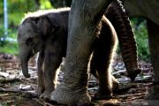Anak Gajah Sumatra yang baru lahir berada di antara kaki dan belalai induknya di kandang Conservation Response Unit (CRU) Alue Kuyun, Woyla Timur, Aceh Barat, Aceh, Sabtu (27/7/2019). Anak Gajah Sumatra jinak yang diberi nama Yuyun lahir pada 24 Juli lalu dari induk gajah jinak bernama Suci (30 tahun). ANTARA FOTO/ Irwansyah Putra/wsj.