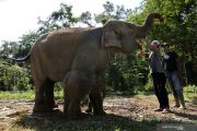 Dokter hewan Balai Konservasi Sumber Daya Alam (BKSDA) Aceh dan pawang gajah (Mahout) Conservation Response Unit (CRU) Alue Kuyun memeriksa kondisi kesehatan induk Gajah Sumatra yang baru melahirkan di Woyla Timur, Aceh Barat, Aceh, Sabtu (27/7/2019). Anak Gajah Sumatra jinak yang diberi nama Yuyun lahir pada 24 Juli lalu dari induk gajah jinak bernama Suci (30 tahun). ANTARA FOTO/ Irwansyah Putra/wsj.