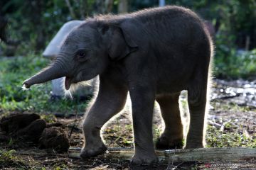 Anak Gajah Sumatra yang baru lahir berada di kandang Conservation Response Unit (CRU) Alue Kuyun, Woyla Timur, Aceh Barat, Aceh, Sabtu (27/7/2019). Anak Gajah Sumatra jinak yang diberi nama Yuyun lahir pada 24 Juli lalu dari induk gajah jinak bernama Suci (30 tahun). ANTARA FOTO/ Irwansyah Putra/wsj.