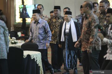 Wakil Presiden Jusuf Kalla (kiri) bersama Wakil Presiden terpilih yang juga Ketua Umum Majelis Ulama Indonesia (MUI) Maruf Amin (tengah) menghadiri acara Tasyakur Milad Ke-44 MUI di Jakarta, Sabtu (27/7/2019). Acara tersebut mengusung tema Meningkatkan Pengkhidmatan dan Kemitraan MUI dalam Rangka Penguatan Ukhuwah Islamiyah dan Persatuan Bangsa. ANTARA FOTO/Andi/dr/hp.
