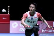 Pebulu tangkis Indonesia Jonatan Christie meluapkan kegembiraan seusai mengalahkan pebulu tangkis Denmark Jan O Jorgensen pada semifinal Japan Open 2019 di Musashino Forest Sport Plaza, Tokyo, Jepang, Sabtu (27/7/2019). Jonatan melaju ke babak final setelah mengalahkan Jan O dengan skor 21-14 dan 21-14. ANTARA FOTO/Humas PP PBSI-Widya/hma/hp.