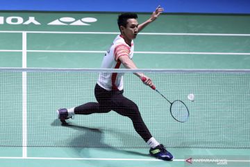 Pebulu tangkis Indonesia Jonatan Christie mengembalikan kok ke pebulu tangkis Denmark Jan O Jorgensen pada semifinal Japan Open 2019 di Musashino Forest Sport Plaza, Tokyo, Jepang, Sabtu (27/7/2019). Jonatan melaju ke babak final setelah mengalahkan Jan O dengan skor 21-14 dan 21-14. ANTARA FOTO/Humas PP PBSI-Widya/hma/hp.