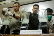Kapolrestabes Makassar, Kombes Pol Wahyu Dwi Ariwibowo (kiri) bersama perwakilan dari Kejaksaan Tinggi Negeri Makassar menuangkan narkoba jenis sabu ke dalam wadah pemusnah saat pemusnahan barang bukti narkotika di Mapolrestabes Makassar, Sulawaesi Selatan, Senin (29/7/2019). Polrestabes Makassar memusnahkan narkotika jenis sabu seberat 1,37 kg dengan nilai sekitar Rp1,6 miliar yang diamankan dari empat orang tersangka. ANTARA FOTO/Arnas Padda/YUhp.