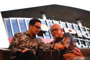 Juru bicara KPK Febri Diansyah berbincang dengan Sekjen Transparency International Indonesia Dadang Trisasongko saat menjadi pembiacara dalam diskusi di Pusat Edukasi Antikorupsi, Jakarta, Senin (29/7/2019). Diskusi tersebut bertema Pertimbangan Keseimbangan Gender dalam Proses Pemilihan Pimpinan KPK. ANTARA FOTO/Sigid Kurniawan/hp.