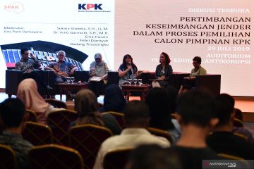 Dari kiri) Juru bicara KPK Febri Diansyah, Sekjen Transparency International Indonesia Dadang Trisasongko, Wakil Ketua KY Sukma Violetta, moderator Gita Putri, Ketua Pansel Capim KPK Yenti Ganarsih, dan agen Saya Perempuan Anti Korupsi Ema Husain menjadi pembicara dalam diskusi di Pusat Edukasi Antikorupsi, Jakarta, Senin (29/7/2019). Diskusi tersebut bertema Pertimbangan Keseimbangan Gender dalam Proses Pemilihan Pimpinan KPK. ANTARA FOTO/Sigid Kurniawan/hp.