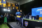 Pemain baru Boca Juniors Daniele De Rossi dan presiden klub Daniel Angelici berpose saat perkenalan dan penandatanganan kontrak di stadion Alberto J. Armando, Buenos Aires, Argentina, Senin (29/7/2019). De Rossi meninggalkan Roma pada akhir musim 2018-2019 setelah membela Giallorossi sejak 2002. ANTARA FOTO/REUTERS/Agustin Marcarian/pras.