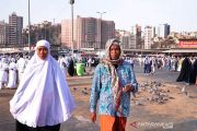 Dua orang jamaah asal Indonesia berjalan menuju Masjidil Haram dari arah Terminal Syeib Amir, Mekkah, Selasa (30/7/2019). Kawasan Masjidil Haram semakin padat dalam beberapa waktu terakhir menjelang puncak musim haji dimulai 8 Dzulhijah 1440 H atau bertepatan 9 Agustus 2019. ANTARA/Hanni Sofia/aa