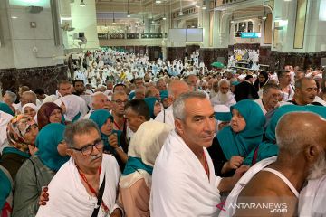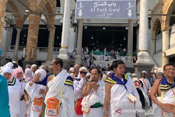 Jamaah asal Indonesia berdoa di salah satu pintu masuk ke Kakbah yakni Al Fath Gate, Masjidil Haram Mekkah, Selasa (30/7/2019). Kawasan Masjidil Haram semakin padat dalam beberapa waktu terakhir menjelang puncak musim haji dimulai 8 Dzulhijah 1440 H atau bertepatan 9 Agustus 2019. ANTARA/Hanni Sofia/aa
