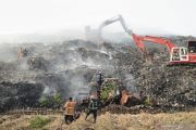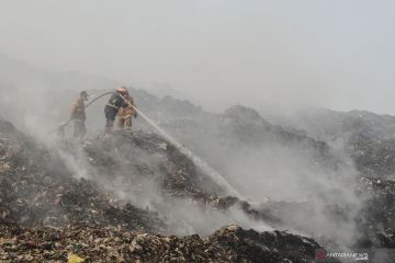 Sejumlah petugas pemadam kebakaran melakukan pendinginan di bekas kebakaran Tempat Pembuangan Akhir (TPA) Burangkeng, Kabupaten Bekasi, Jawa Barat, Jumat (2/8/2019). Penyebab kebakaran yang terjadi pada pukul 14.00 WIB tersebut masih dalam penyelidikan petugas. ANTARA FOTO/Fakhri Hermansyah/hp.