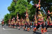 Peserta menggunakan pakaian adat khas Dayak mengikuti gerak jalan indah di Jombang, Jawa Timur, Sabtu (3/8/2019). Dalam lomba gerak jalan indah yang diikuti ribuan pelajar tingkat Sekolah Dasar (SD) sederajat dan Sekolah Menengah Pertama (SMP) sederajat se-Kabupaten Jombang untuk memperingati HUT ke-74 RI itu setiap peserta menampilkan variasi barisan unik dan kreatif sebagai tontonan masyarakat. ANTARA FOTO/Syaiful Arif/ama.